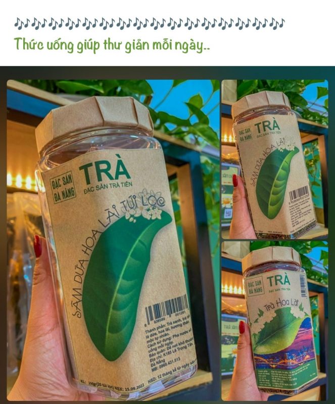 Trà sâm dứa Đà Nẵng là đặc sản rất được ưa chuộng, sản phẩm được sản xuất từ những búp Trà non, Lá dứa nép kết hợp với hoa Lài, hoa Sói, hoa Ngâu và Trà tiên tạo hương vị đặc trưng cho sản phẩm. Vị đắng hậu ngọt – Vị chát trà xanh và mùi thơm thơm dễ chịu của lá dứa. Được sản xuất từ trà xanh chất lượng cao, kết hợp lá dứa và các loại thảo mộc. Phù hợp cho giải khát và tốt cho sức khỏe. Có tác dụng tốt nếu uống vào mỗi buổi sáng để thanh lọc cơ thể.
